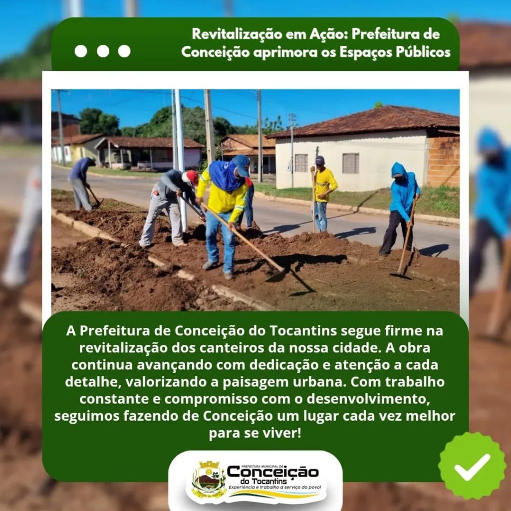 A Prefeitura de Conceição do Tocantins segue firme na revitalização dos canteiros da nossa cidade. A obra continua avançando com dedicação e atenção a cada detalhe, valorizando a paisagem urbana. Com trabalho constante e compromisso com o desenvolvimento, seguimos fazendo de Conceição um lugar cada vez melhor para se viver! #PrefeituraDeConceição #Revitalização #CidadeMaisBonita