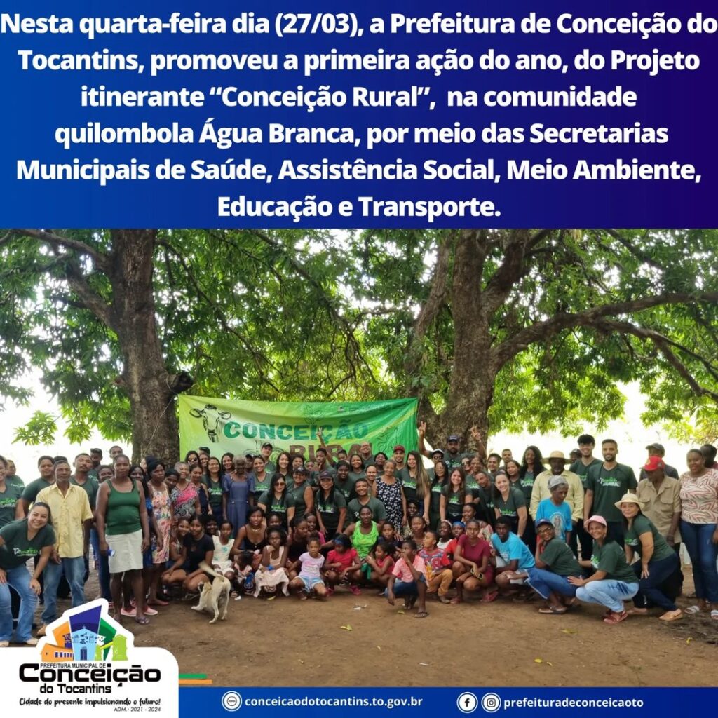 A Prefeitura de Conceição do Tocantins, por meio das Secretarias Municipais de Saúde, Educação, Assistência Social, Meio Ambiente e Agricultura e Transporte realizou nesta última quarta-feira, 27/03 a primeira ação do corrente ano do Projeto Conceição Rural na região da Comunidade Quilombola Água Branca. A ação contou com atendimento médico, exames laboratoriais, atendimento odontológico, a […]