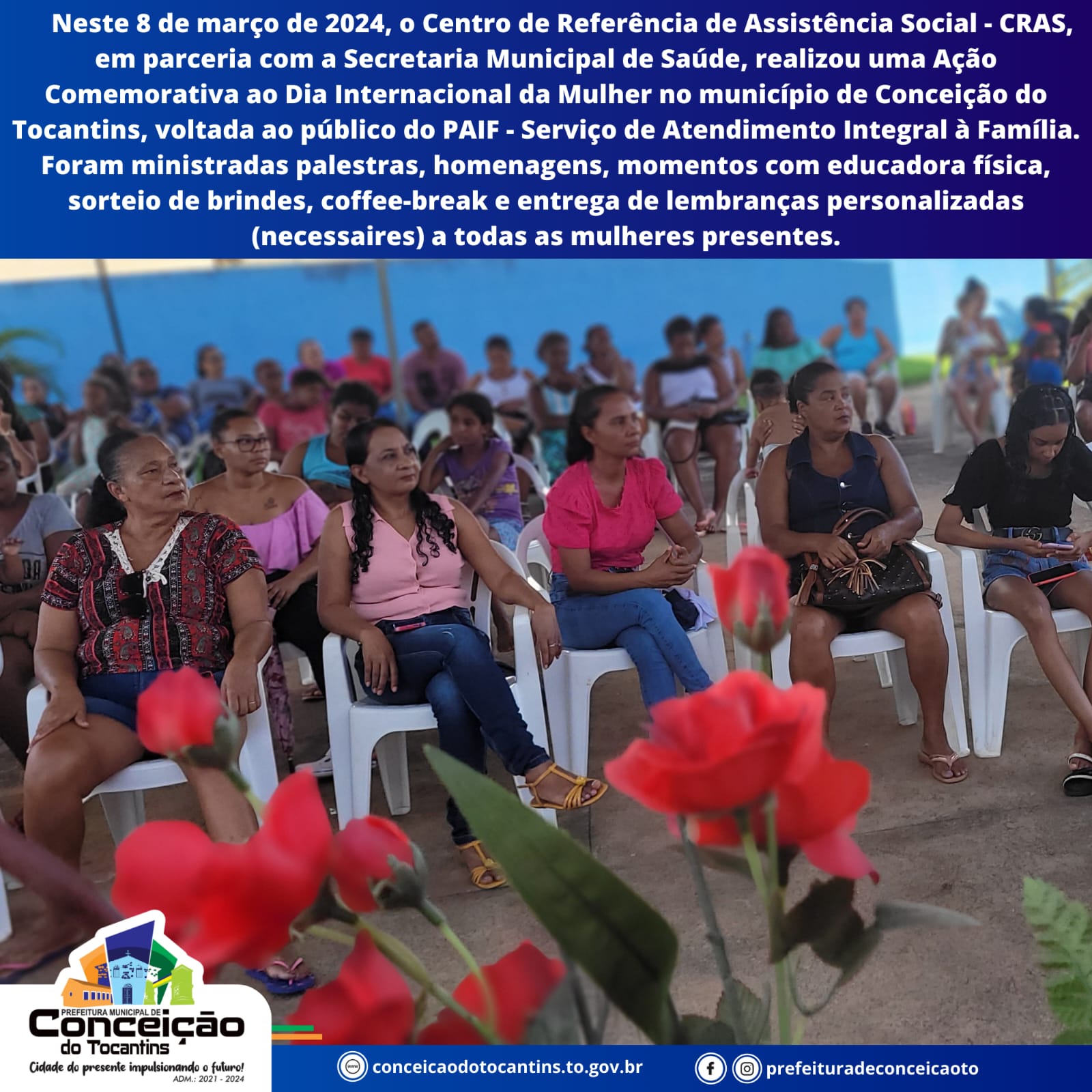No dia 8 de março de 2024, o Centro de Referência de Assistência Social – CRAS, em parceria com a Secretaria Municipal de Saúde, realizou uma Ação Comemorativa ao Dia Internacional da Mulher no município de Conceição do Tocantins, voltada ao público do PAIF – Serviço de Atendimento Integral à Família. Foram ministradas palestras, homenagens, momentos com educadora física, sorteio de brindes, coffee-break e entrega de lembranças personalizadas (necessaires) a todas as mulheres presentes.